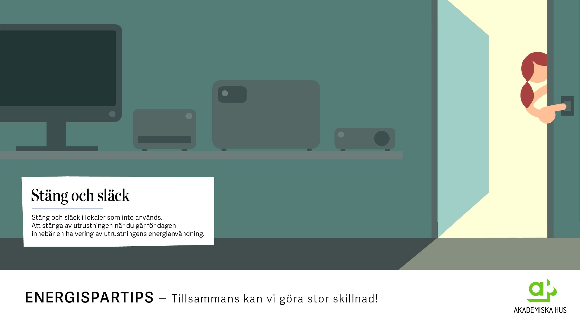 Close and switch off rooms that are not in use. Turning off equipment when you leave for the day means halving the equipment's energy use.