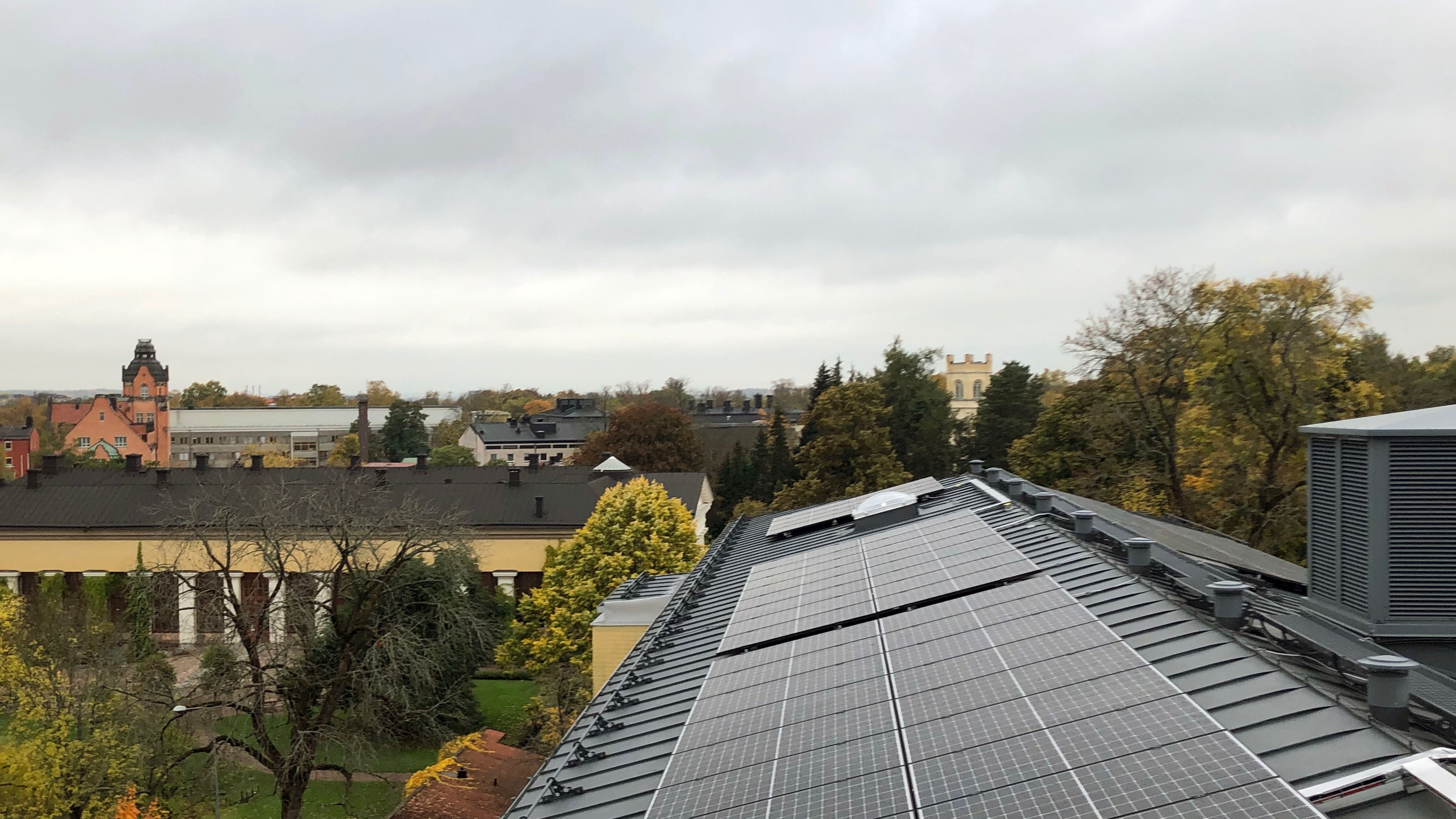 Akademiska Hus has invested SEK 15.5 million in the total of seven photovoltaic systems with a total area of approximately 4,200 m2 that have been installed in Uppsala. It is mainly roofs of buildings where Uppsala University conducts its activities that have been covered with solar cells, including House 16 in the English Park, Blåsenhus, Campus 1477 and Ekonomikum. The facilities produce approximately 520,000 kWh per year and enable the university's premises in the four buildings to be supplied to some extent with environmentally friendly solar.