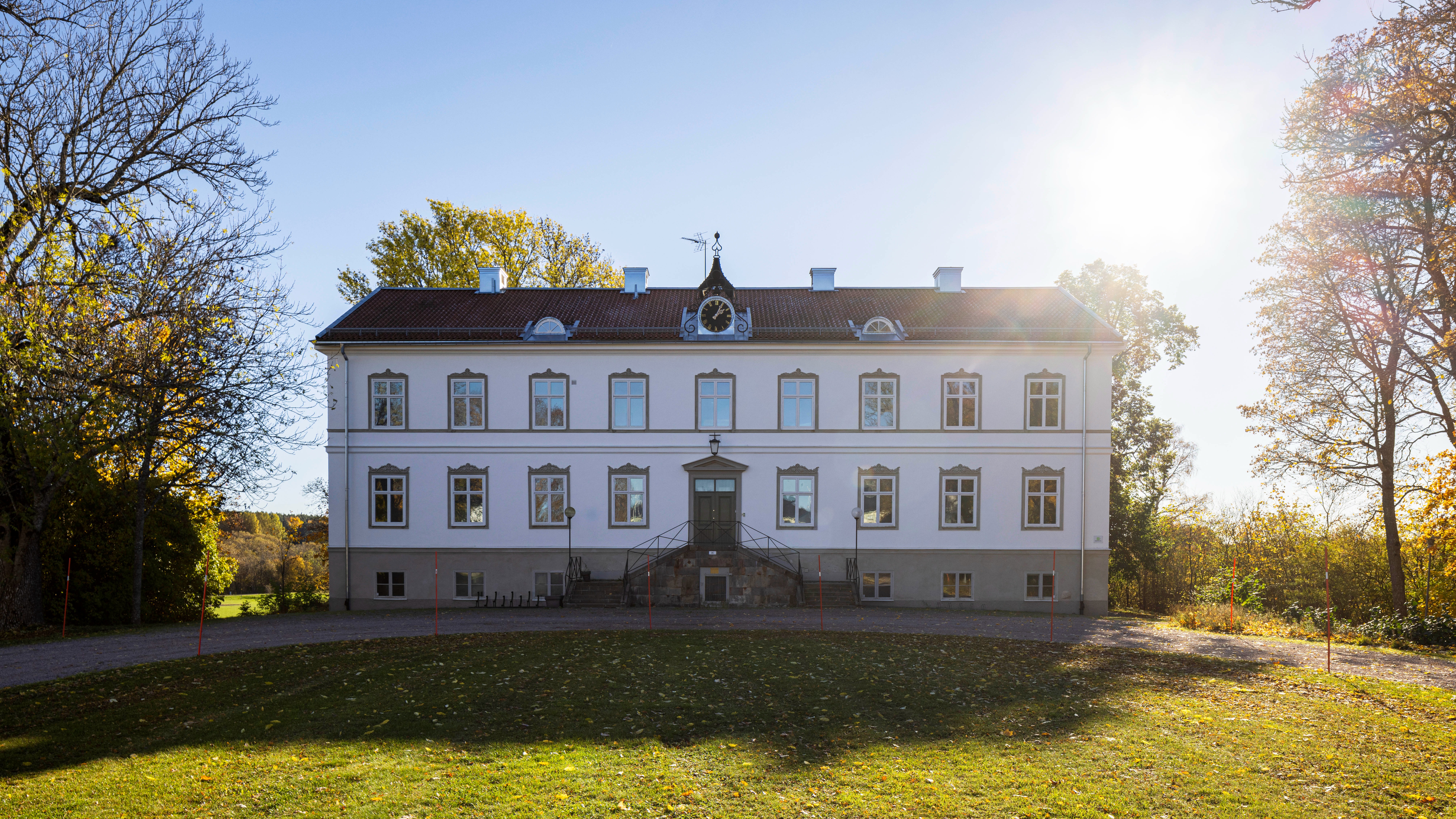Administrative building - Ultuna kungsgård's corp-de-logi-built of plastered brick on 2.5 floors, as well as a partially furnished attic under a brick roof. Reddish alcohol-plastered plinth, yellow basement floor with yellow window joinery. The upper floors are white and have yellow profiled window surrounds with acroteria. White painted window joinery. Gable-crowned straight-closed main portal with green-painted double mirror doors. Double free staircase of reddish sandstone with iron railing in front of the main entrance. In the middle of the roof of the main facade sits a clock with a round dial and gold numerals, surrounded by wrought iron ornaments. The clock is flanked by two semi-circular domes.